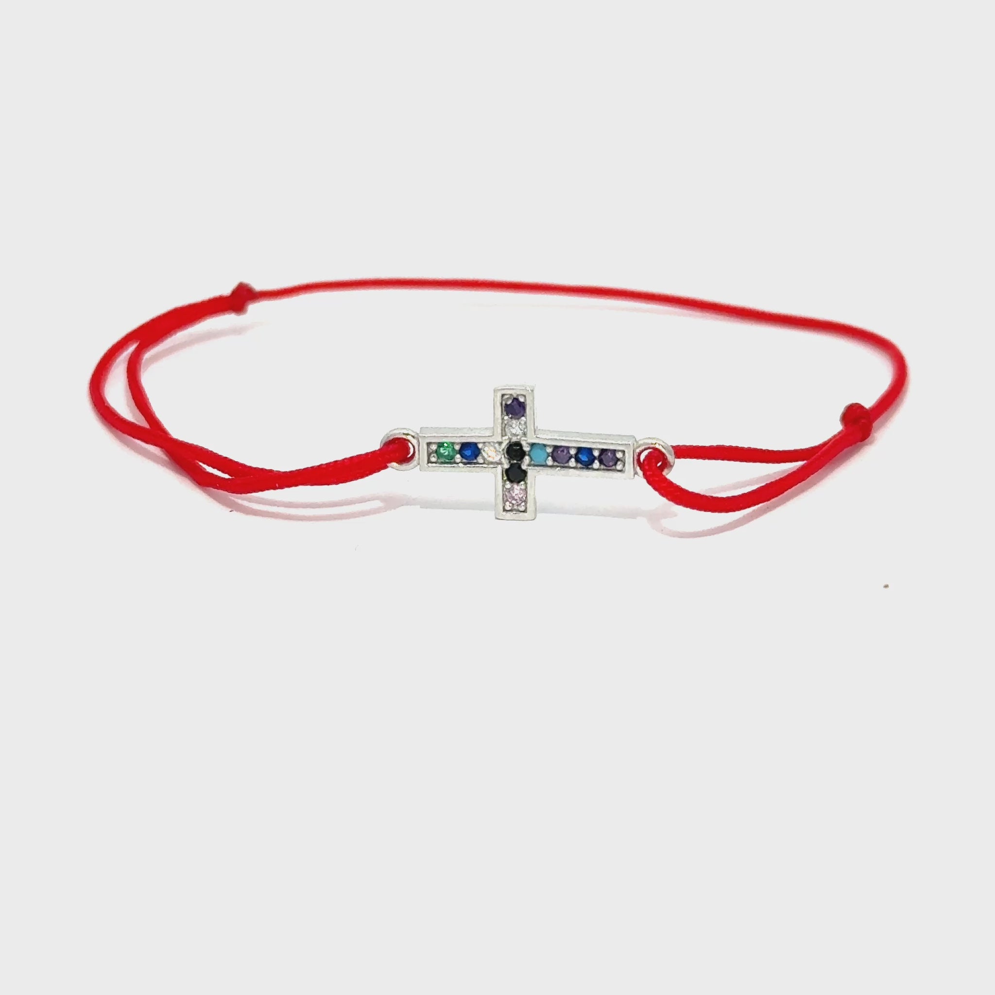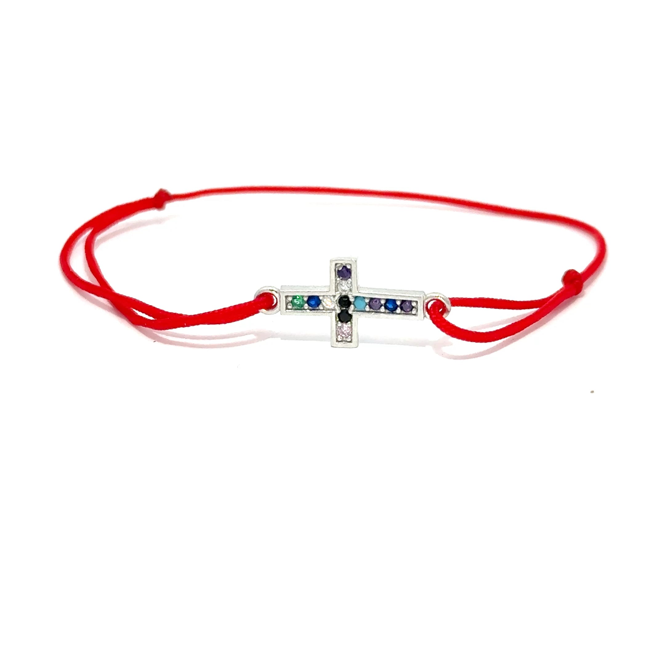 Această brățară rafinată din șfoară roșie este accesorizată cu o cruciuliță strălucitoare, împodobită cu cristale colorate. Un simbol al protecției și al luminii, pandantivul conferă brățării un aer elegant și jucăuș în același timp. Perfectă pentru cei mici, brățara este ajustabilă, comodă și ideală pentru ocazii speciale sau purtare zilnică.