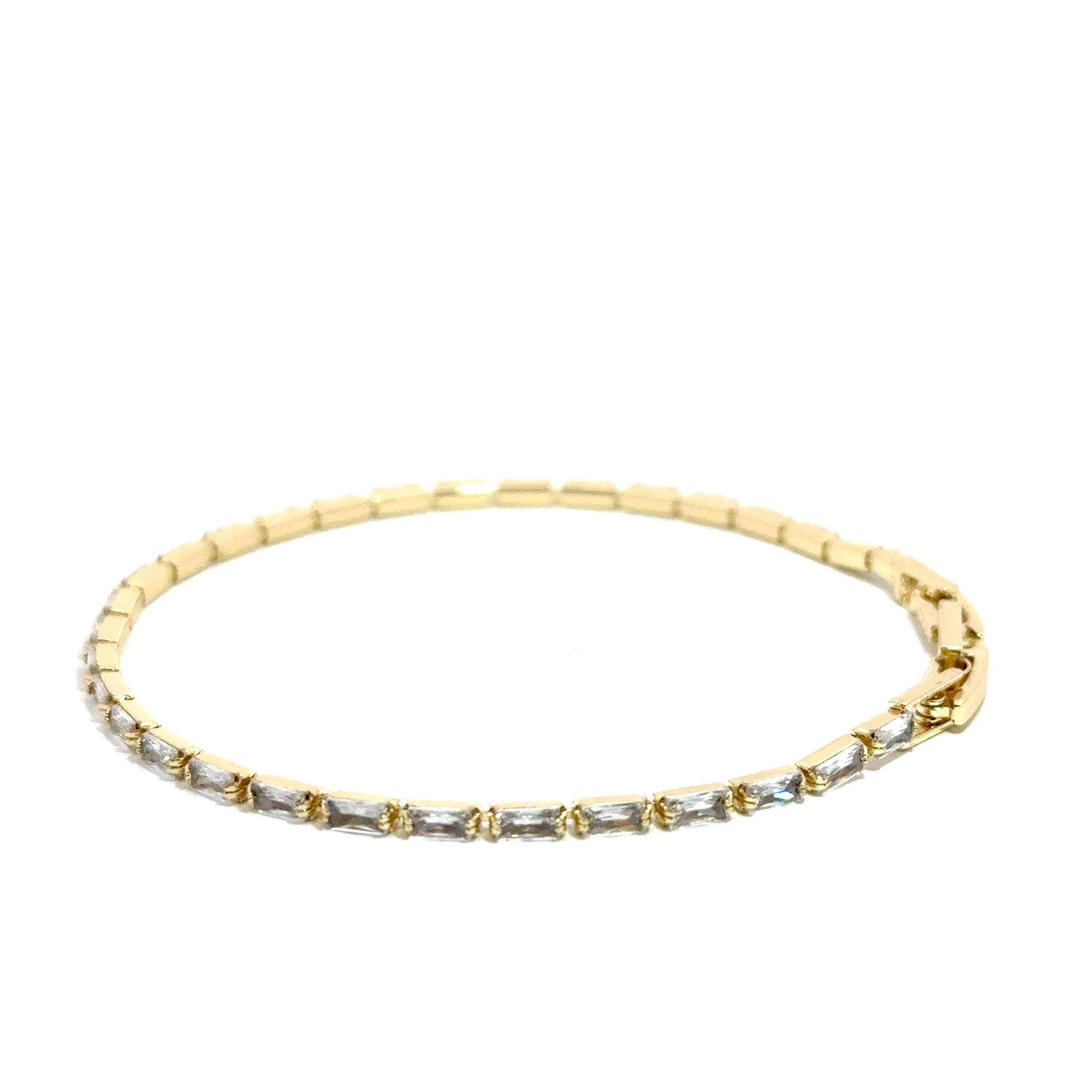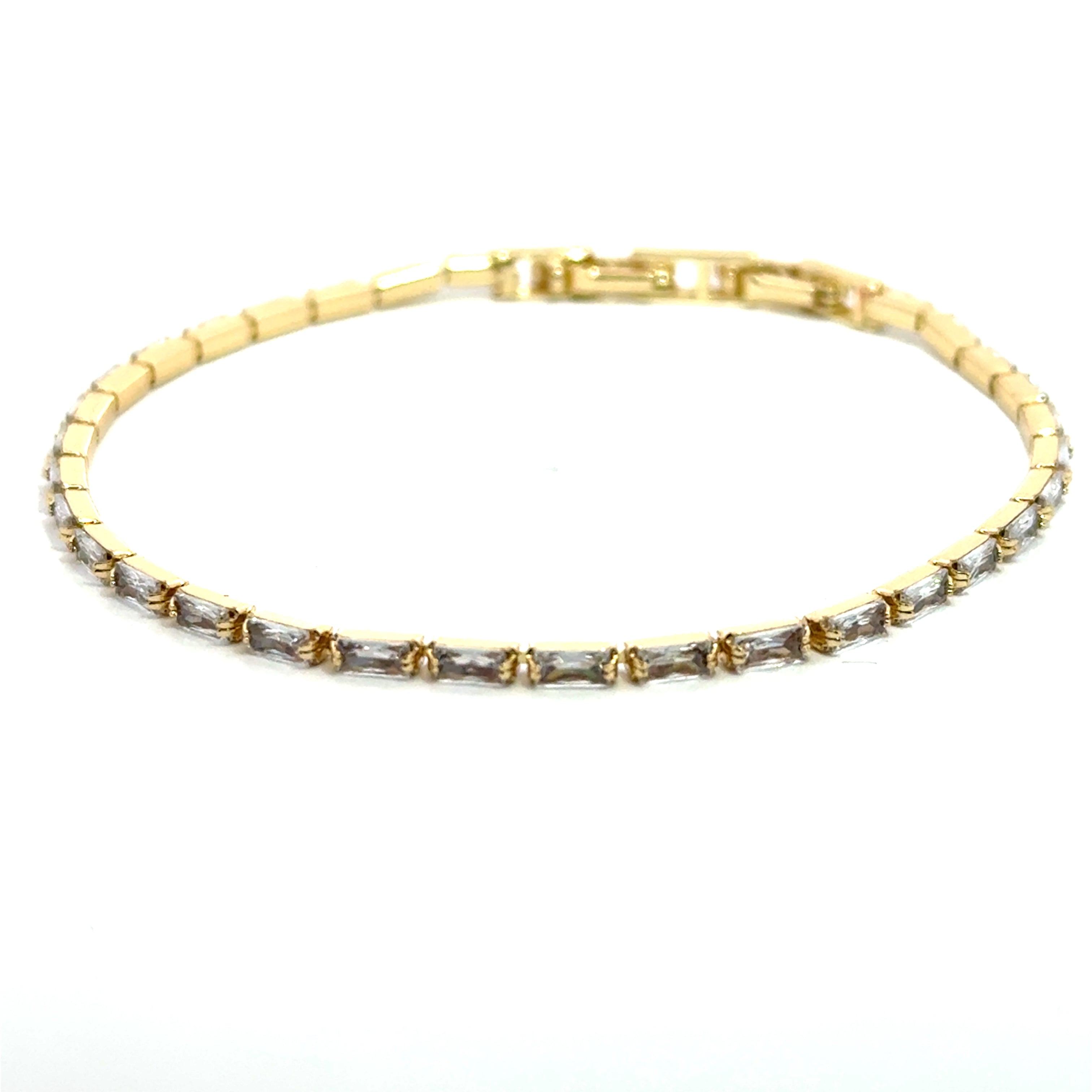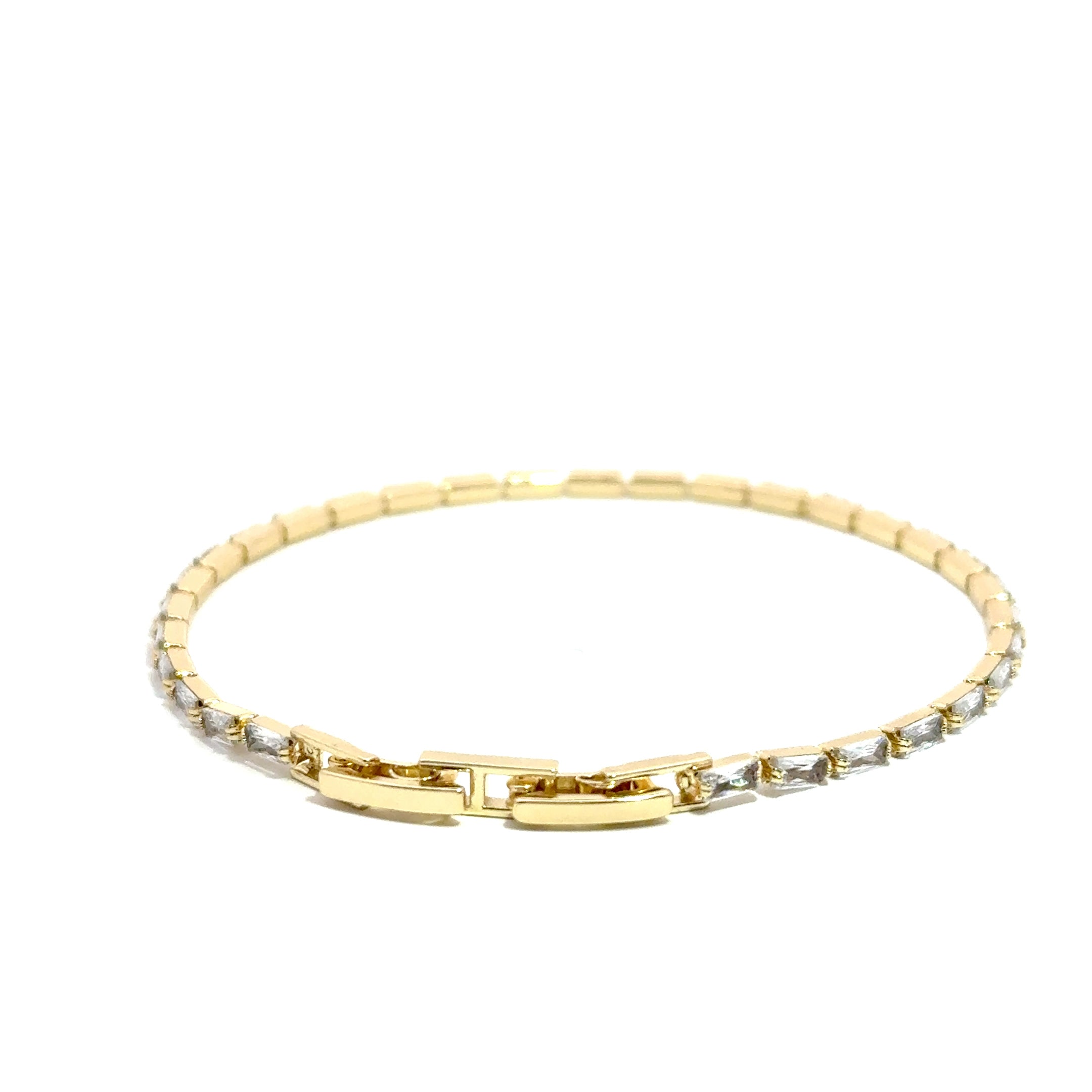 Rafinată și modernă, această brățară placată cu aur adaugă un plus de eleganță oricărei ținute. Detaliile tip cristale baghette, usor transparente, contrastante, îi oferă un aer sofisticat și versatil, perfect atât pentru ocazii speciale, cât și pentru purtarea de zi cu zi. Realizată din materiale de calitate, este gândită să-și păstreze strălucirea și stilul în timp.