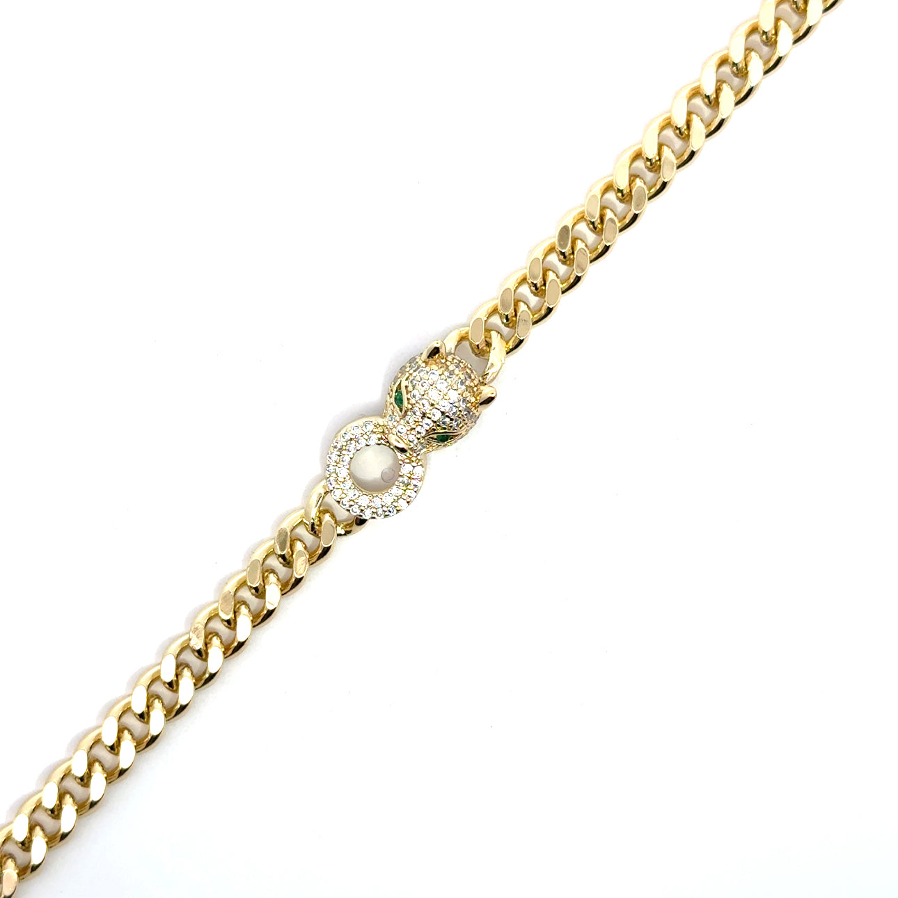 Aceasta brățara emană forță, eleganță și încredere — simbolul perfect al unei personalități puternice. Realizată din zale masive placate cu aur și accesorizată cu un cap de panteră cu detalii fine, această piesă este mai mult decât un accesoriu: este o declarație de stil.