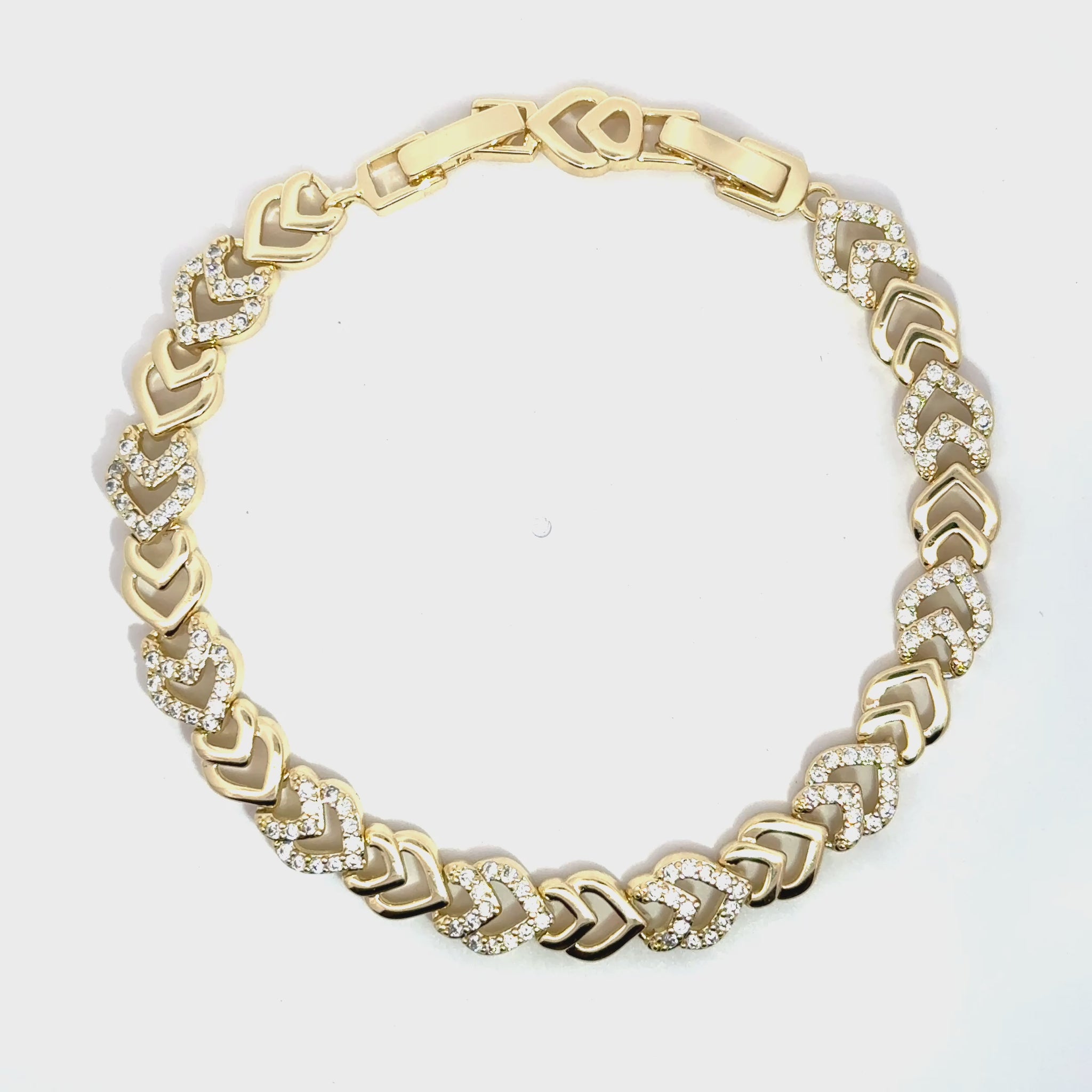Brățară damă placată cu aur, cu design elegant de inimi suprapuse – ușoară, versatilă și strălucitoare, poate fi purtată atât zilnic, cât și la ocazii speciale.