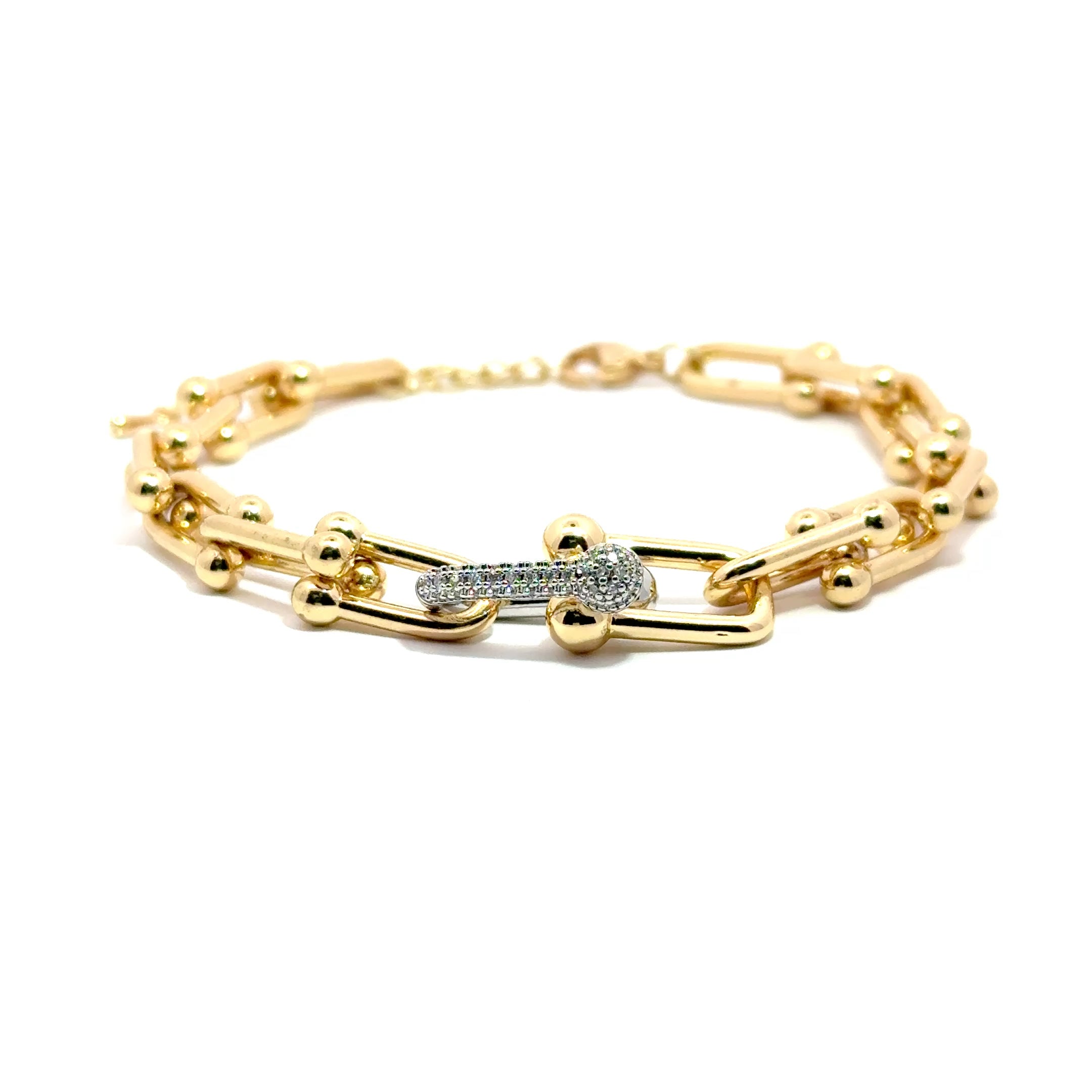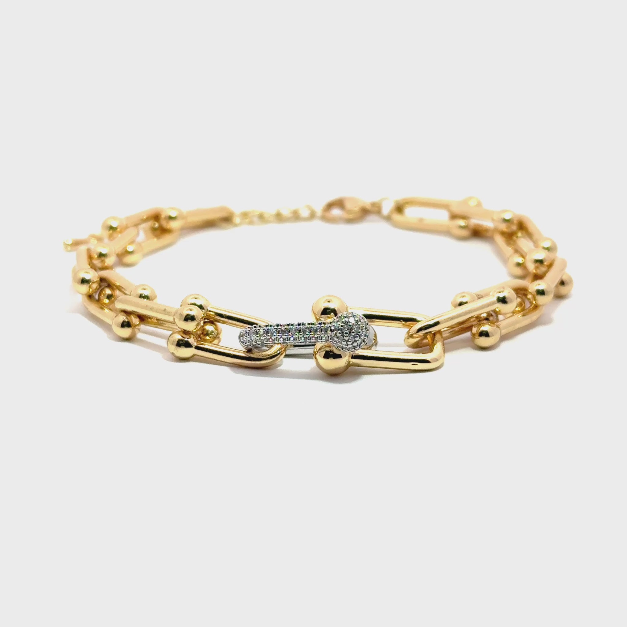 Placată cu aur de înaltă calitate, brățara este rezistentă la uzură și își păstrează strălucirea în timp. Poate fi purtată atât solo, pentru un look minimalist dar puternic, cât și în combinație cu alte accesorii pentru un efect statement.