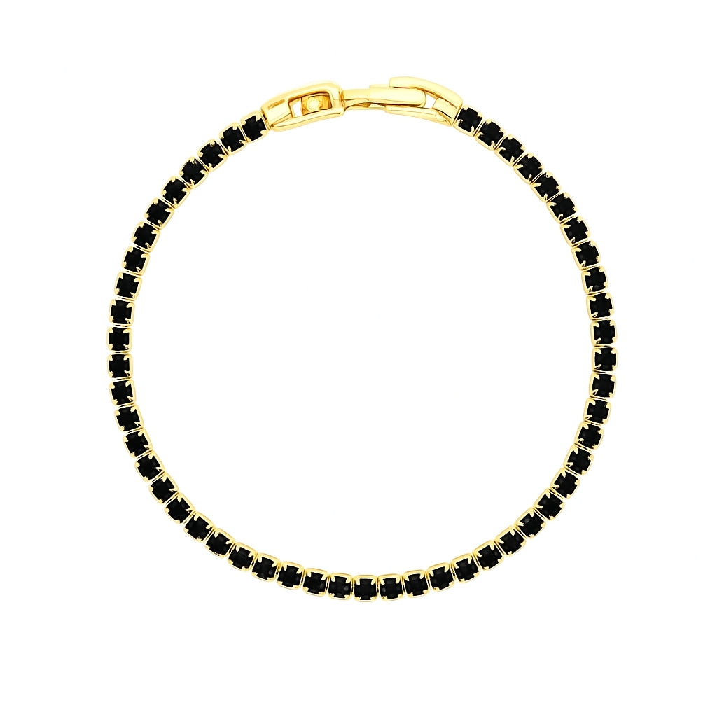 Îmbină eleganța clasică cu un aer modern prin această brățară tennis neagră, realizată din metale comune și placată cu aur. Designul sofisticat și nuanța intensă o fac ideală atât pentru ținute de zi, cât și pentru evenimente speciale.