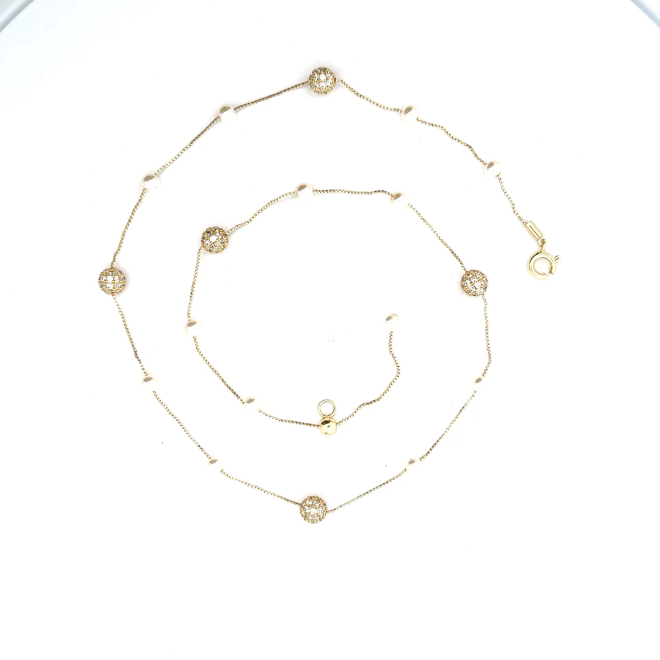 Colier rafinat placat cu aur, decorat cu perle delicate și sfere cu cristale fine. Un accesoriu subtil, dar plin de strălucire, perfect pentru a completa ținutele elegante de zi sau de seară. Designul minimalist adaugă o notă de feminitate și sofisticare oricărui look.