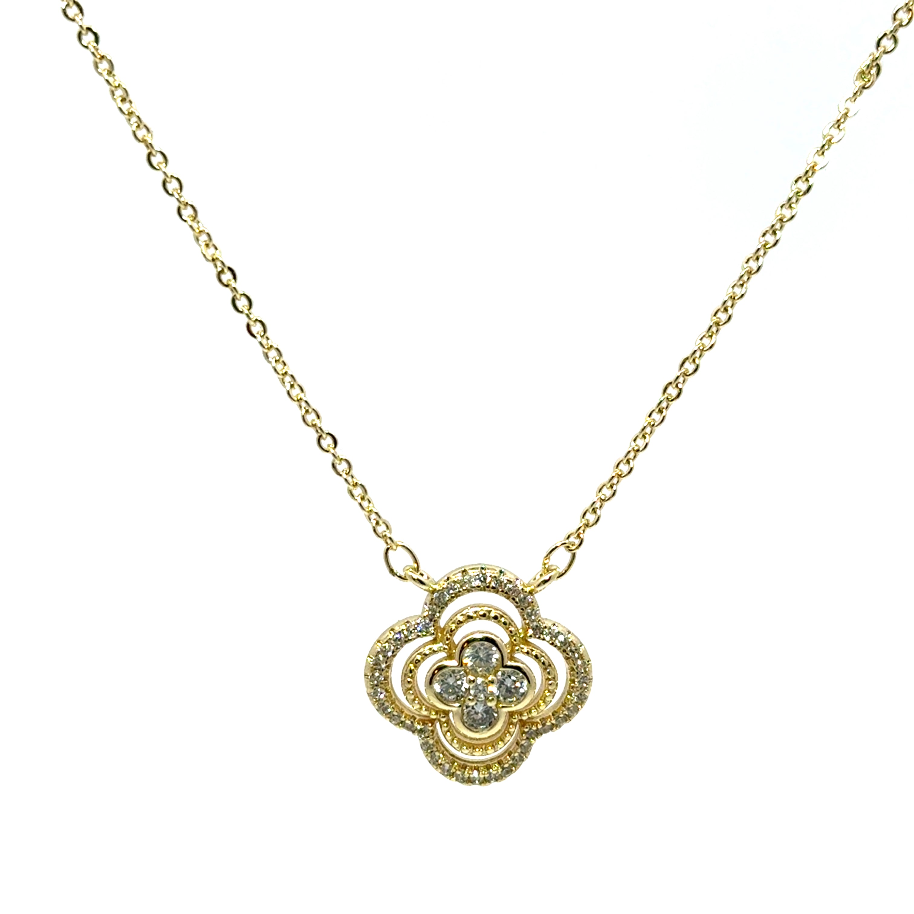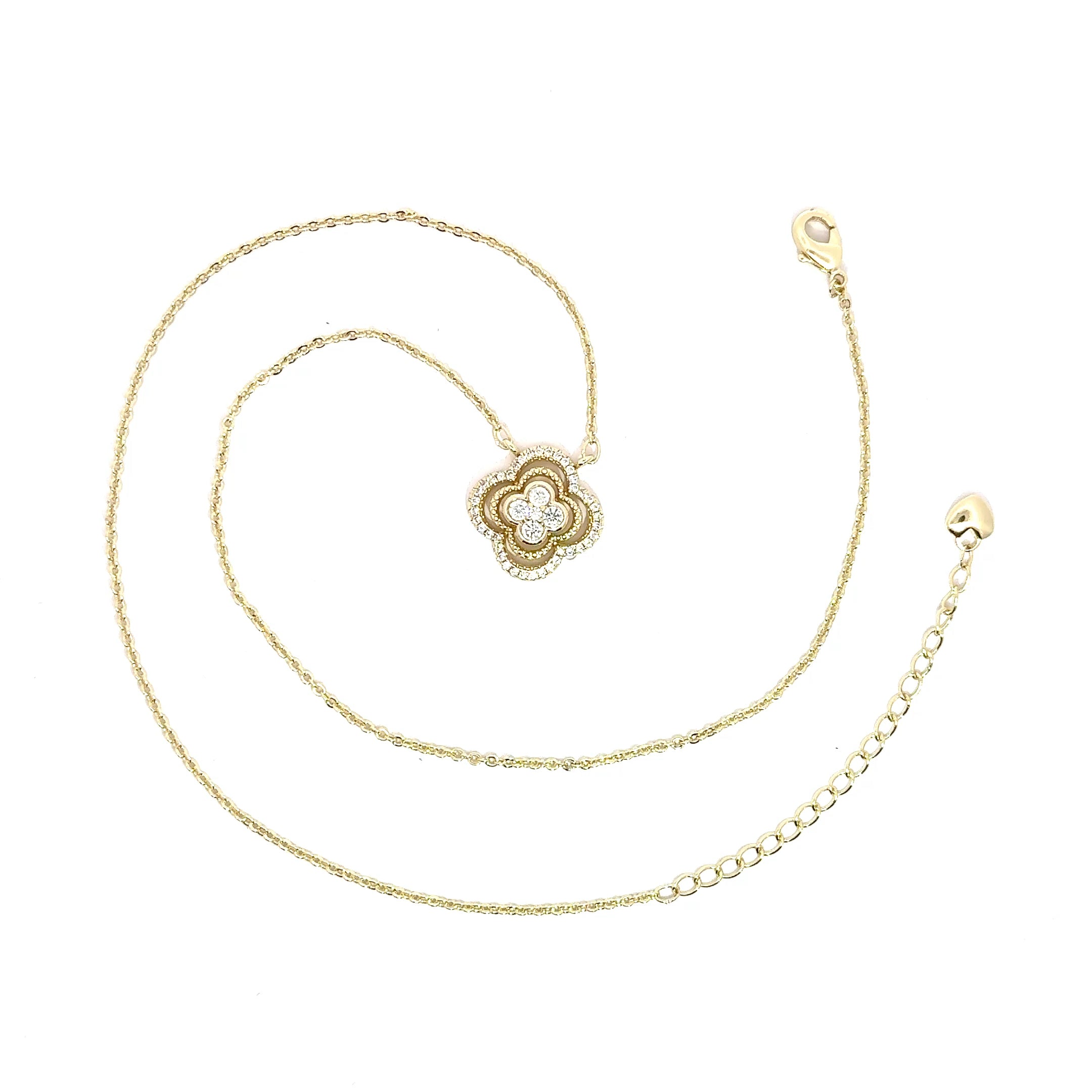 Lănțișor placat cu aur de 18K, decorat cu un pandantiv în formă de Floare, accesorizat cu cristale zirconia cubic. Un accesoriu delicat și rafinat, perfect pentru a adăuga o notă de eleganță oricărei ținute. Ideal pentru ocazii speciale sau pentru a fi purtat zi de zi, ca simbol al stilului și al feminității.